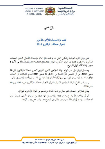 أصدرت وزارة التربية الوطنية والتكوين المهني اليوم بلاغا أعلنت فيه عن تمديد فترة تسجيل المترشحين الأحرارلاجتياز امتحانات البكالوريا. غير أن هذا التمديد يخص فقط فترة إيداع ترشيحات الأحرار لاجتياز امتحانات البكالوريا برسم دورة 2016 عبر البوابة الإلكترونية للوزارة. وهكذا أصبح آخر أجل للتسجيل هو يوم الأحد 6 دجنبر 2015. أما أجل إيداع ملف طلب الترشيح لدى المصالح المختصة بالنيابات الإقليمية للوزارة فقد كان هو يوم الإثنين 30 نونبر 2015، حسب ما هو مبين في البوابة الإلكترونية إلى غاية هذه الساعة .